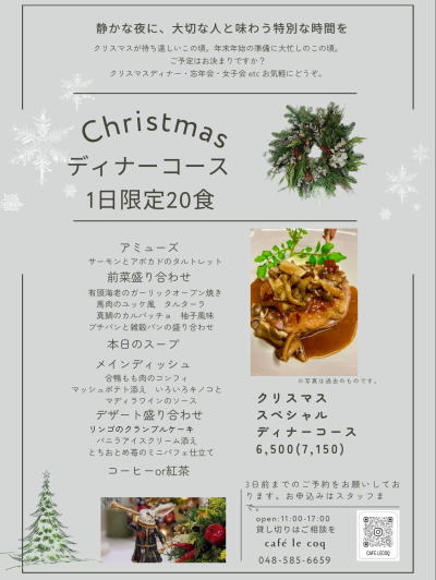 23日、24日、25日は本格クリスマスディナーコース(限定数)をご用意します。